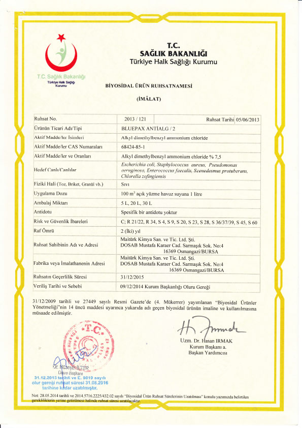 BLUEPAX ANTIALG yüzme havuzu sularında kullanılan yosun giderici ve önleyicidir. Daha önceden oluşmuş biyolojik birikimleri hızlı bir şekilde yok eder ve yeniden oluşumunu engeller.