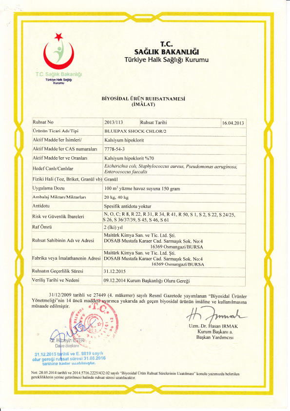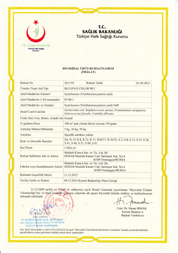 Yüzme havuzu suyu dezenfeksiyonu için kullanılır.
