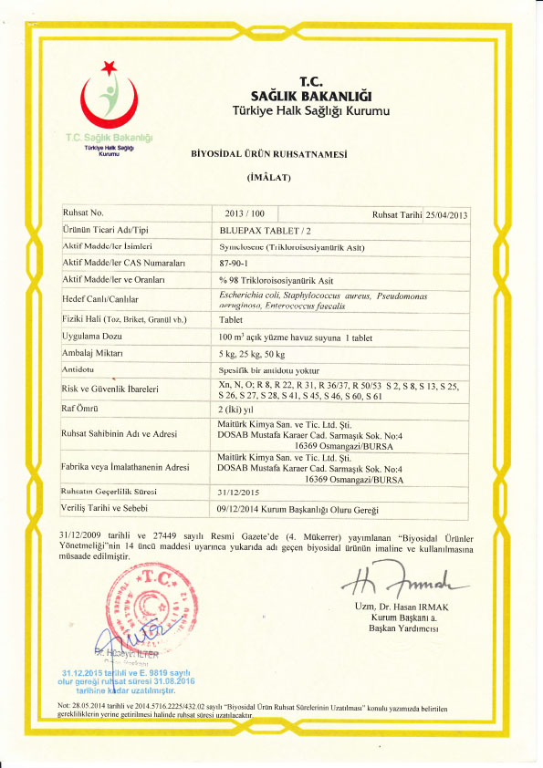 TABLET, yüzme havuzu sularının dezenfeksiyonunda kullanılan, yavaş çözünen, aktif klor bazlı, kireç ihtiva etmeyen ve sürekli klorlama yapabilen tablet şeklinde bir maddedir.